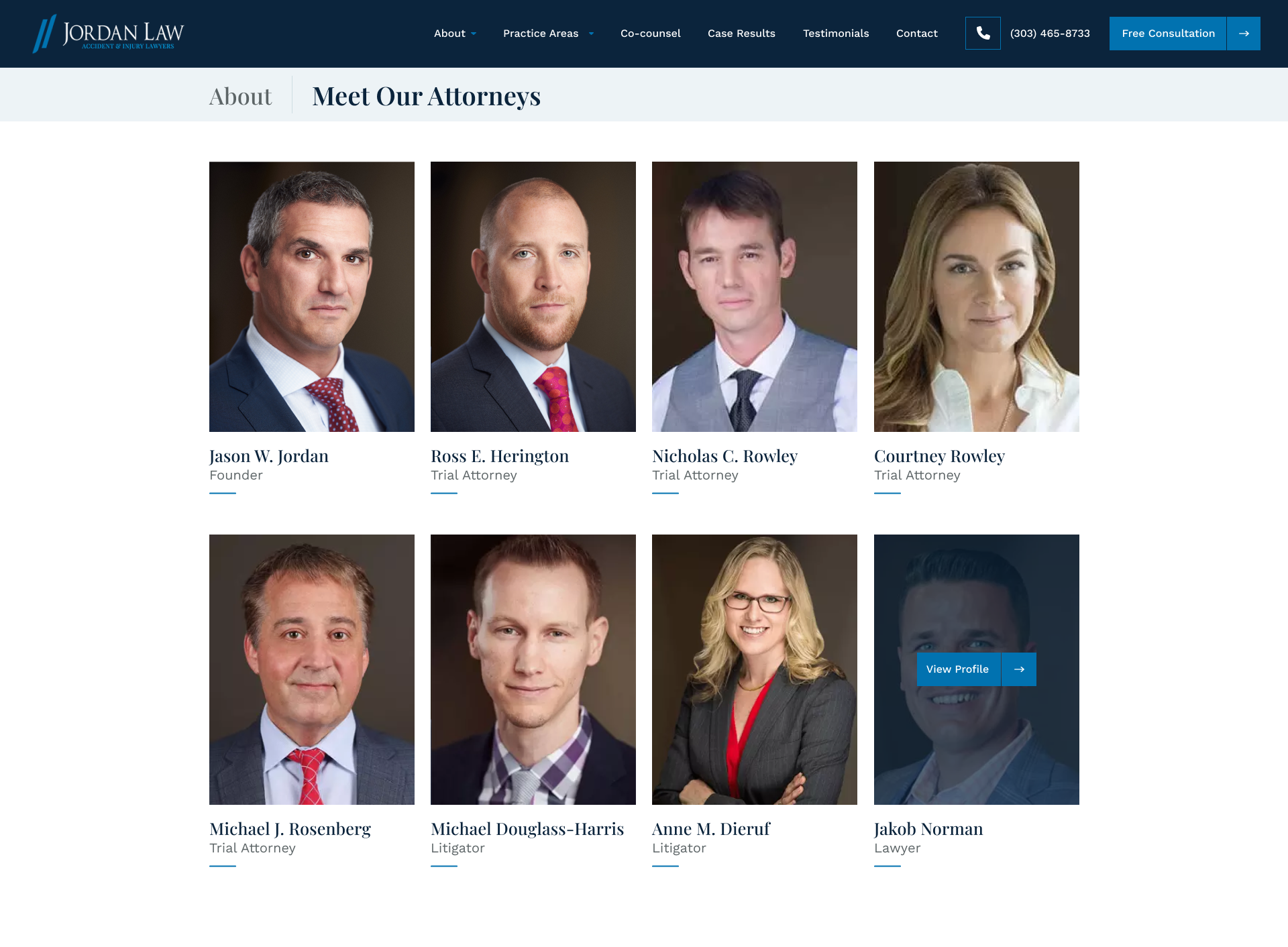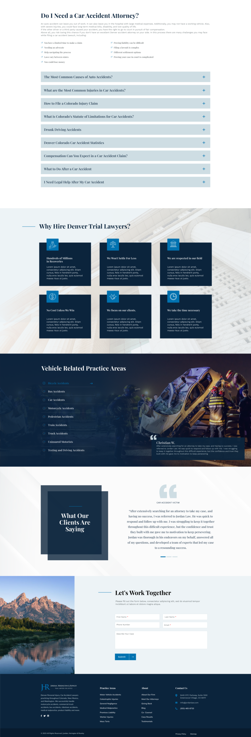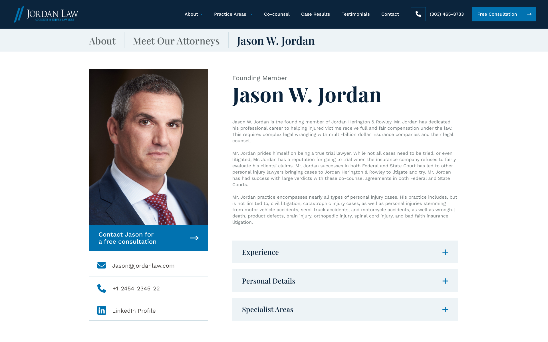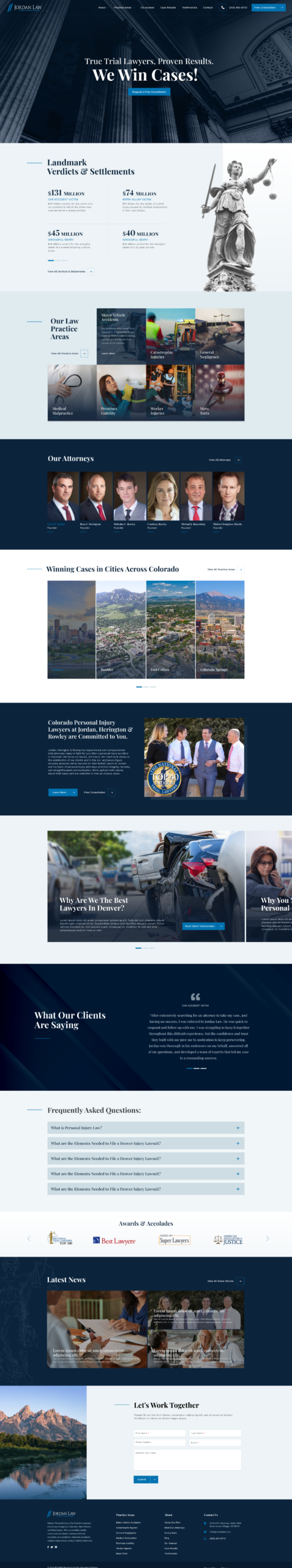 The brief was a full custom WordPress redesign and rebuild — modernising the look and feel, stripping out plugin dependency and building a content structure that Jordan Law’s small internal team could manage themselves long-term without needing a developer for every update. Practice area pages built to perform on search. Location pages for Denver, Boulder, Fort Collins, Colorado Springs and beyond. A clear, trust-building user journey from first visit to free consultation. A results page that let the numbers do the talking. Twelve to fourteen weeks to deliver.